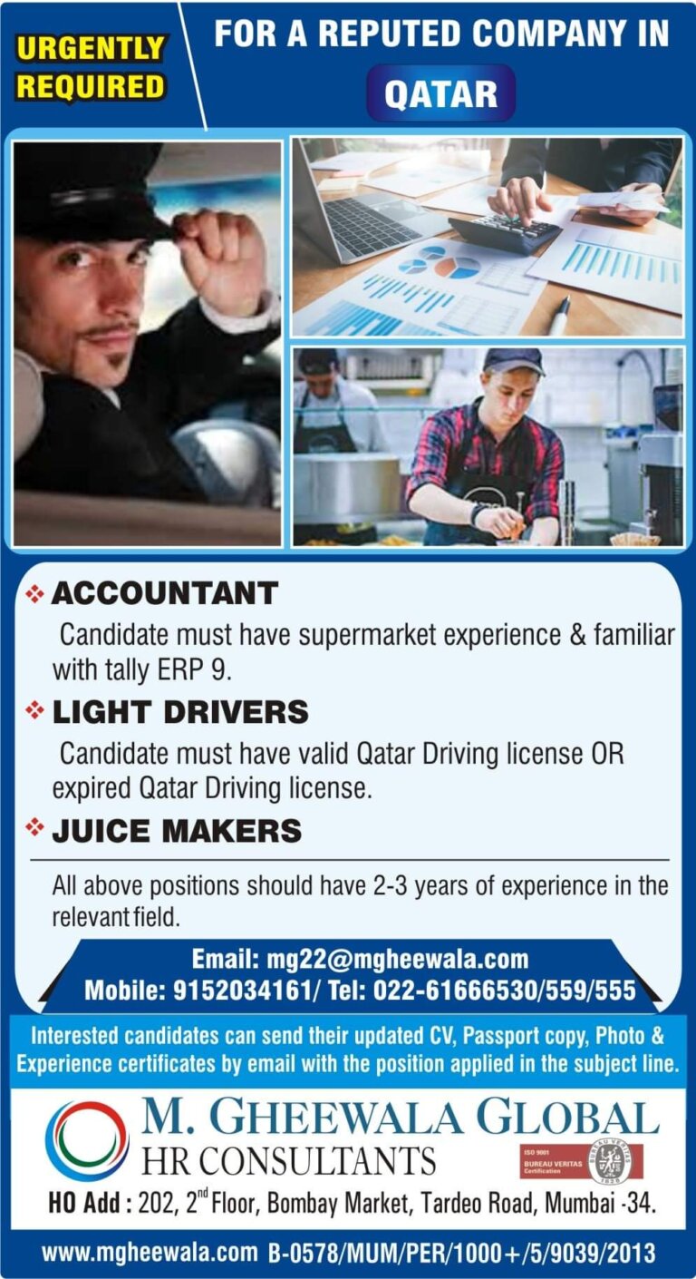FOR A REPUTED COMPANY INURGENTLY REQUIRED ACCOUNTANT QATARCandidate must have supermarket experience & familiarwith tally ERP 9.LIGHT DRIVERSCandidate must have …