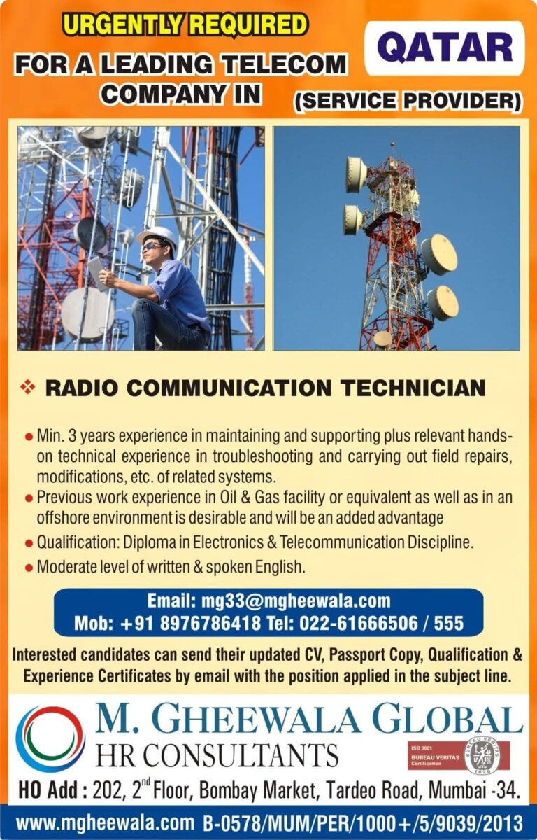 FOR A LEADING TELECOMCOMPANY IN (SERVICE PROVIDER)RADIO COMMUNICATION TECHNICIANo Min. 3 years experience in maintaining and supporting plus relevant hands-on …