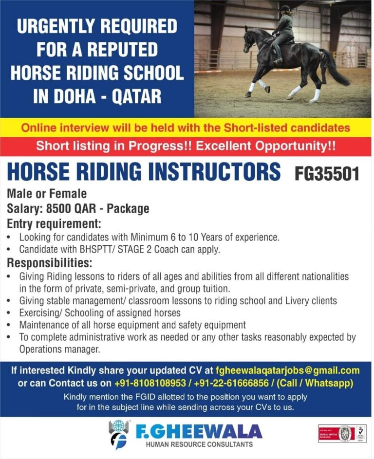 URGENTLY REQUIREDFOR A REPUTEDHORSE RIDING SCHOOLIN DOHA – QATAROnline interview will be held with the Short-listed candidatesShort listing in Progress!! …