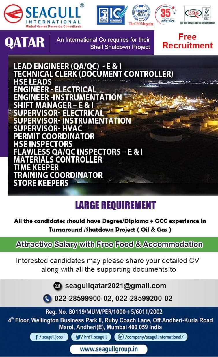 An International Co requires for theirQATARRecruitmentShell Shutdown ProjectLEAD ENGINEER (QA/QC) -E & ITECHNICAL CLERK (DOCUMENT CONTROLLER)I-ISE LEADSENGINEER s- ELECTRICALENGINEER -INSTRUMENTATIONSHIFT …