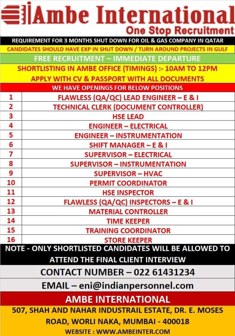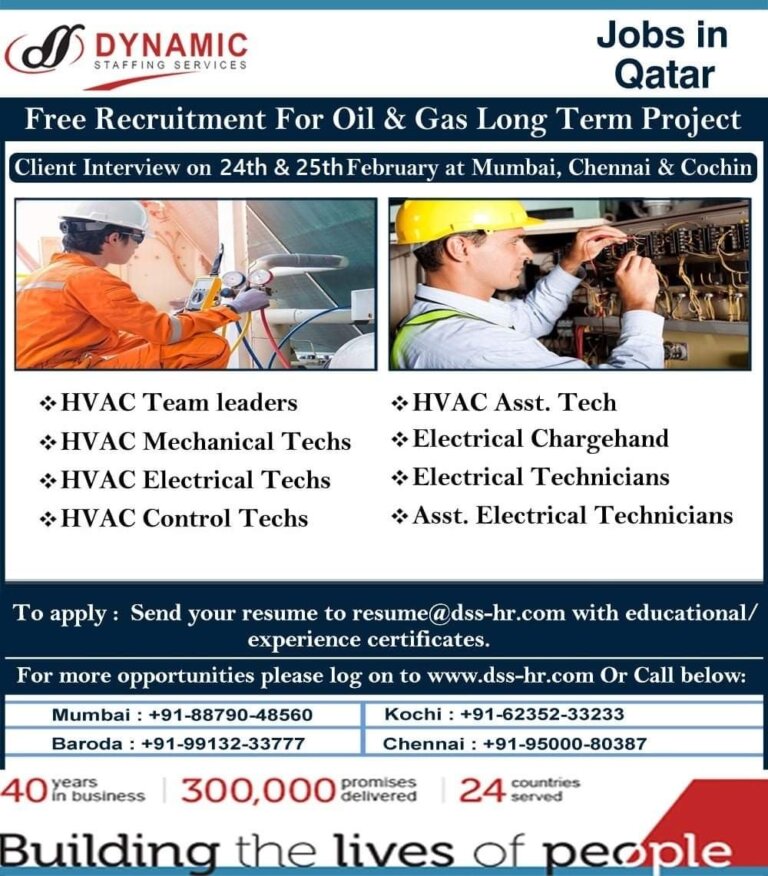 Jobs in QatarFree Recruitment For Oil & Gas Long Term ProjectClient Interview on 24th & 25th February at Mumbai, Chennai …