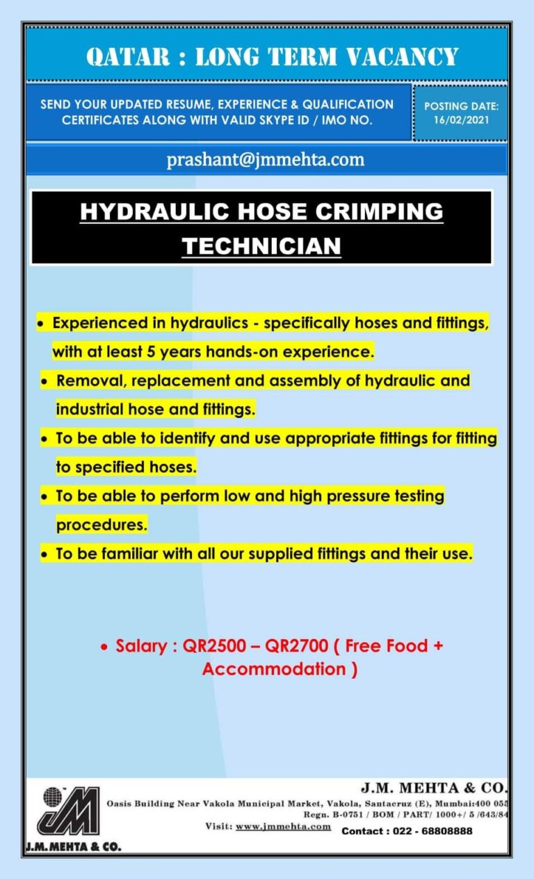 QATAR : LONG TERM VACANCYSEND YOUR UPDATED RESUME, EXPERIENCE & QUALIFICATIONCERTIFICATES ALONG WITH VALID SKYPE ID / IMO NO.prashant@jmmehta.comPOSTING DATE:16/02/2021HYDRAULIC …
