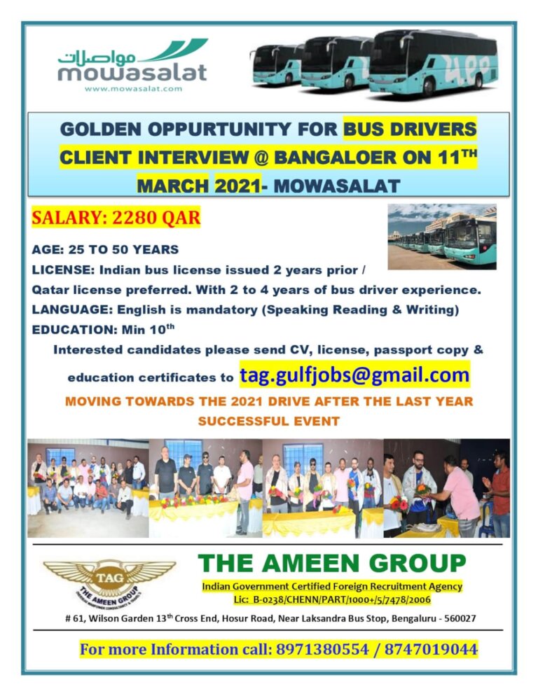 GOLDEN OPPURTUNITY FOR BUS DRIVERSCLIENT INTERVIEW @ BANGALOER ON 11THMARCH 2021- MOWASALATSALARY: 2280 QARAGE: 25 TO 50 YEARSLICENSE: Indian bus …