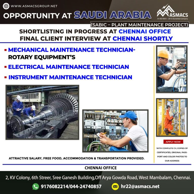 OPPORTUNITY AT SAUDI ARABIA (SABIC – PLANT MAINTENANCE PROJECT)SHORTLISTING IN PROGRESS AT CHENNAI OFFICEFINAL CLIENT INTERVIEW AT CHENNAI SHORTLY■ MECHANICAL …