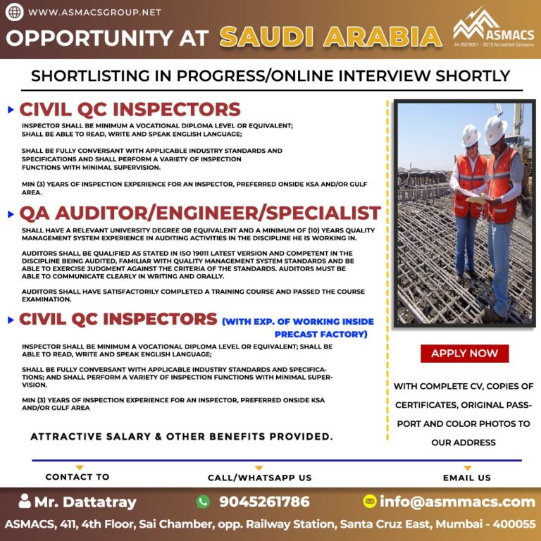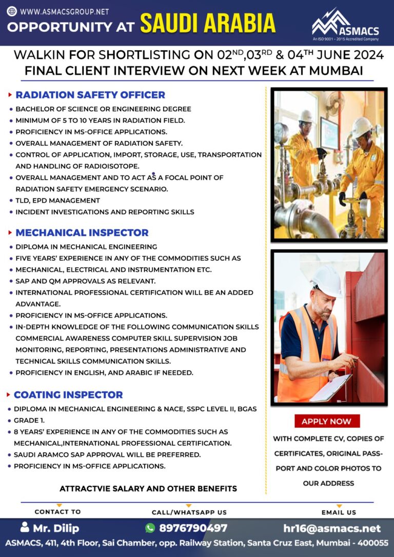 OPPORTUNITY AT SAUDI ARABIAASMACSAn ISO 9001-2015 Accredited CompanyWALKIN FOR SHORTLISTING ON 02ND, 03RD & 04TH JUNE 2024FINAL CLIENT INTERVIEW ON …