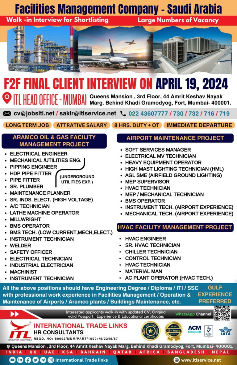 Facilities Management Company – Saudi ArabiaWalk-in Interview for ShortlistingLarge Numbers of VacancyF2F FINAL CLIENT INTERVIEW ON APRIL 19, 2024ITL HEAD …