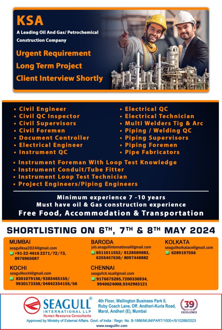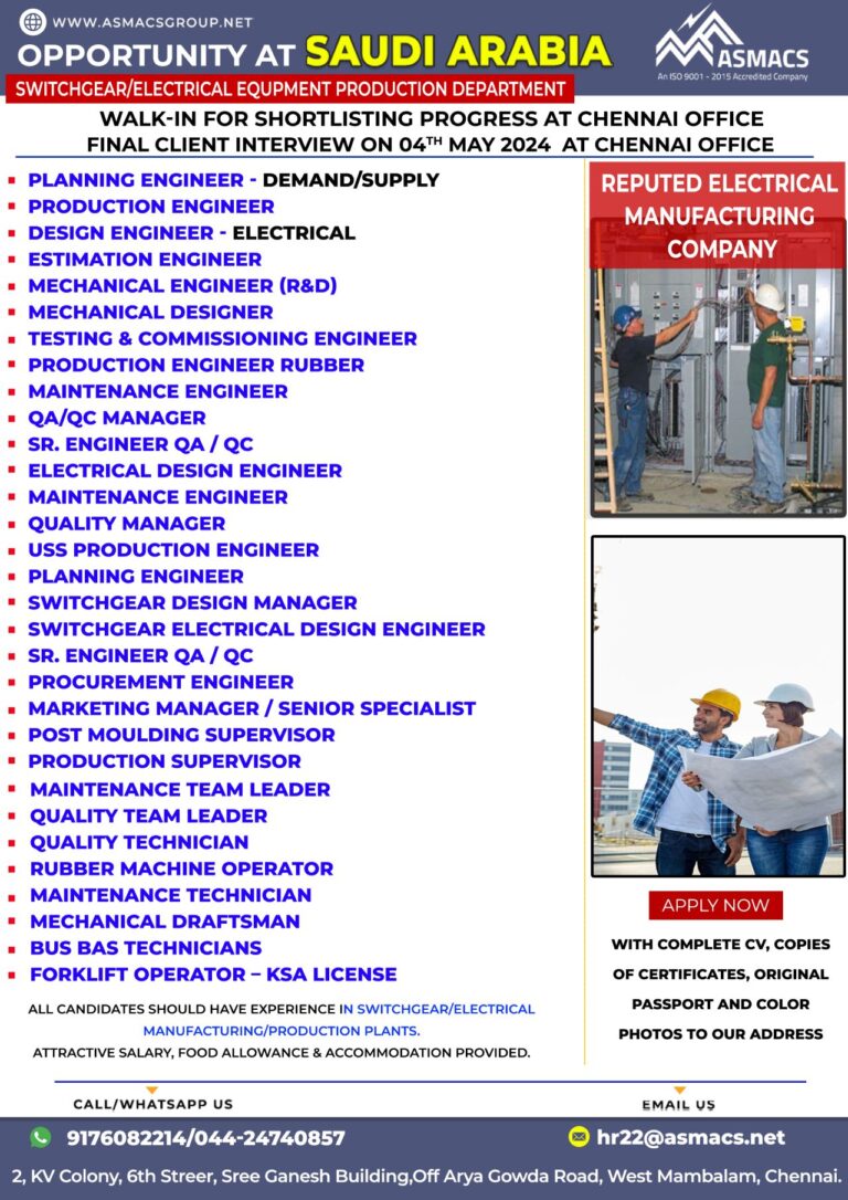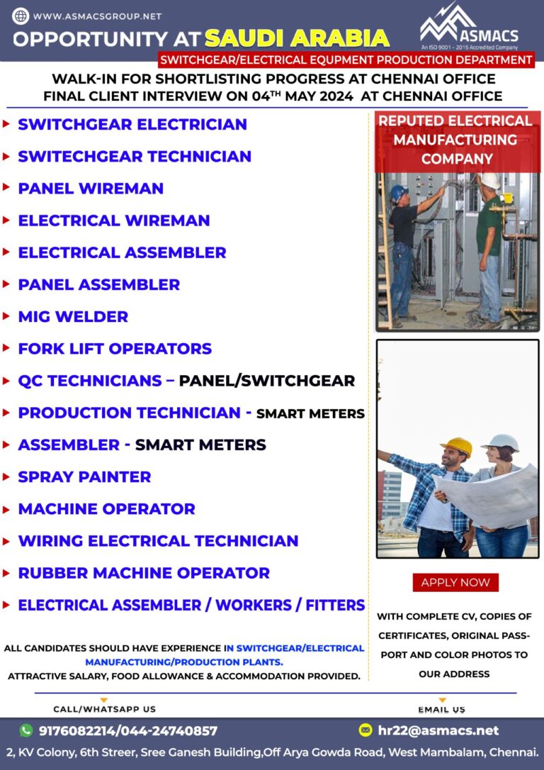 OPPORTUNITY AT SAUDI ARABIASWITCHGEAR/ELECTRICAL EQUPMENT PRODUCTION DEPARTMENTWALK-IN FOR SHORTLISTING PROGRESS AT CHENNAI OFFICEFINAL CLIENT INTERVIEW ON 04TH MAY 2024 AT …