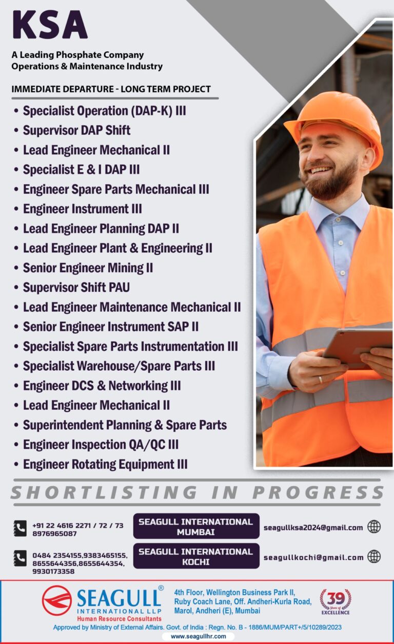 KSAA Leading Phosphate CompanyOperations & Maintenance IndustryIMMEDIATE DEPARTURE – LONG TERM PROJECT Telegram Group Join Now