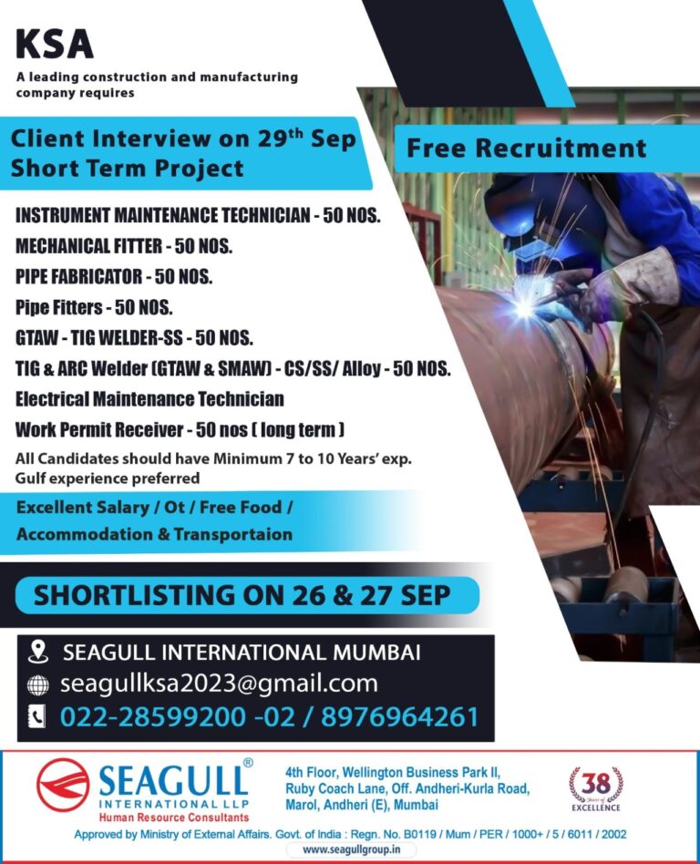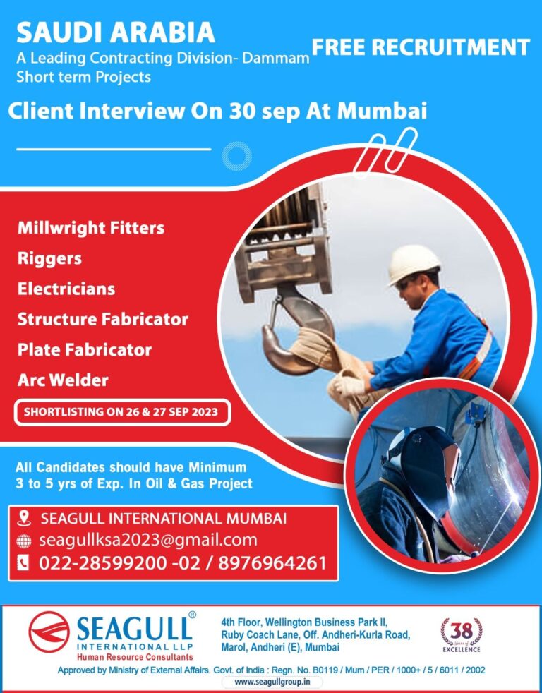 SAUDI ARABIAA Leading Contracting Division- DammamShort term ProjectsFREE RECRUITMENTClient Interview On 30 sep At MumbaiMillwright FittersRiggersElectriciansStructure FabricatorPlate FabricatorArc WelderSHORTLISTING ON …