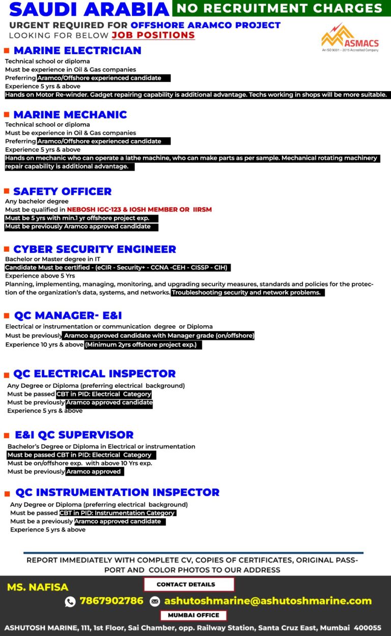 SAUDI ARABIA NO RECRUITMENT CHARGESURGENT REQUIRED FOR OFFSHORE ARAMCO PROJECTLOOKING FOR BELOW JOB POSITIONS■ MARINE ELECTRICIANTechnical school or diplomaMust be …