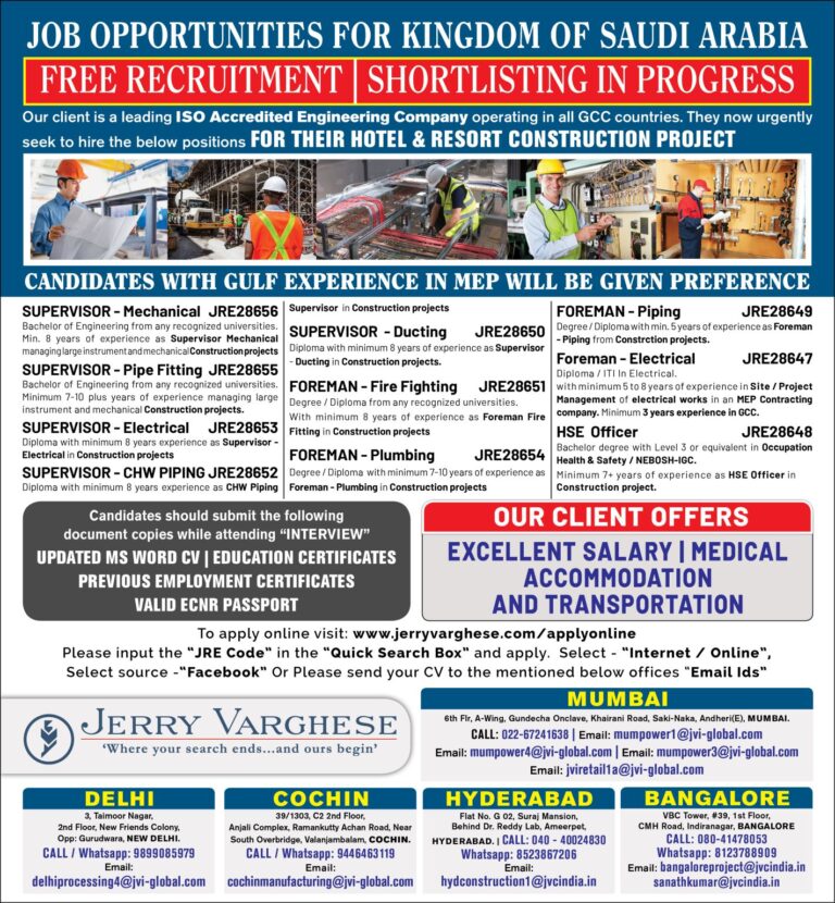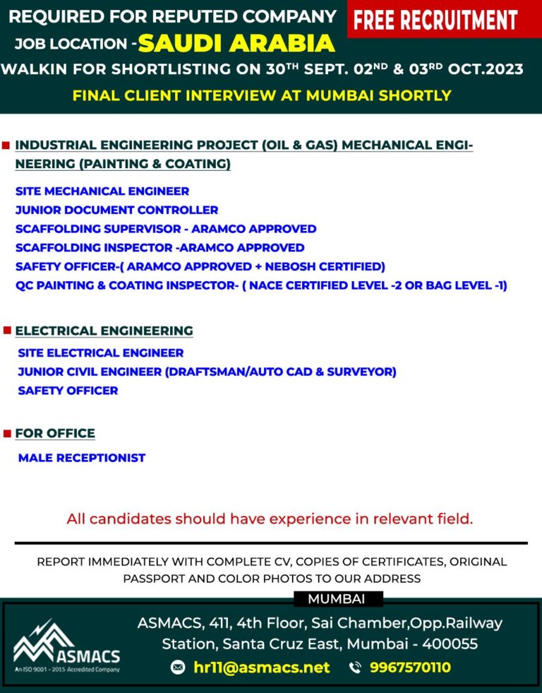 REQUIRED FOR REPUTED COMPANYJOB LOCATION – SAUDI ARABIAFREE RECRUITMENTWALKIN FOR SHORTLISTING ON 30TH SEPT. 02ND & 03RD OCT.2023FINAL CLIENT INTERVIEW …