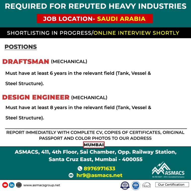 REQUIRED FOR REPUTED HEAVY INDUSTRIESJOB LOCATION-SAUDISHORTLISTING IN PROGRESS/ONLINE INTERVIEW SHORTLYPOSTIONSDRAFTSMAN (MECHANICAL)Must have at least 6 years in the relevant field …