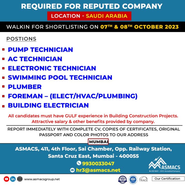 REQUIRED FOR REPUTED COMPANYLOCATION – SAUDI ARABIAWALKIN FOR SHORTLISTING ON 07TH & 08TH OCTOBER 2023POSTIONS■ PUMP TECHNICIAN■AC TECHNICIAN■ ELECTRONIC TECHNICIAN▪ …
