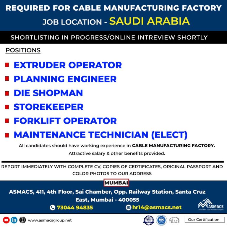 REQUIRED FOR CABLE MANUFACTURING FACTORYJOB LOCATION – SAUDI ARABIASHORTLISTING IN PROGRESS/ONLINE INTREVIEW SHORTLYPOSITIONS■ EXTRUDER OPERATOR■ PLANNING ENGINEER■ DIE SHOPMAN■ STOREKEEPER■FORKLIFT …