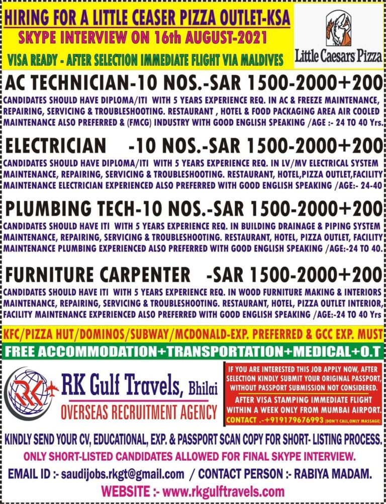 HIRING FOR A LITTLE CEASER PIZZA OUTLET-KSASKYPE INTERVIEW ON 16th AUGUST 2021VISA READY – AFTER SELECTION IMMEDIATE FLIGHT VIA MALDIVES …