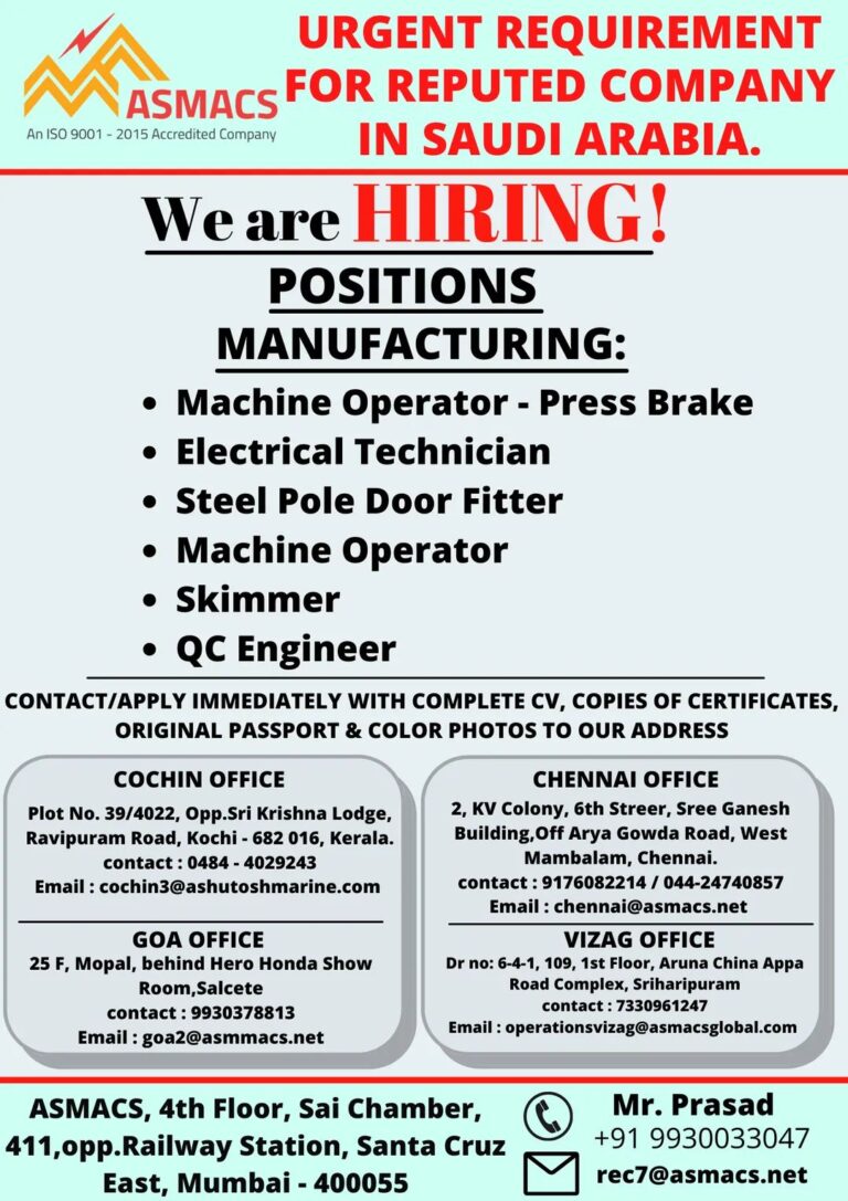 URGENT REQUIREMENTASMACS FOR REPUTED COMPANYIN SAUDI ARABIA.We are HIRING!POSITIONSMANUFACTURING:• Machine Operator – Press BrakeElectrical Technician• Steel Pole Door Fitter• Machine …