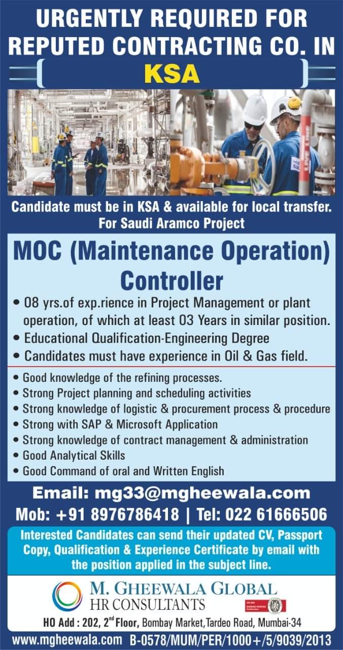 URGENTLY REQUIRED FORREPUTED CONTRACTING CO. IN KSACandidate must be in KSA & available for local transfer.For Saudi Aramco ProjectMOC (Maintenance …