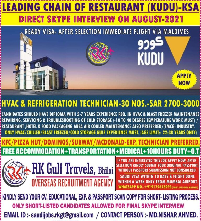 LEADING CHAIN OF RESTAURANT (KUDU)-KSADIRECT SKYPE INTERVIEW ON AUGUST-2021READY VISA- AFTER SELECTION IMMEDIATE FLIGHT VIA MALDIVESHVAC & REFRIGERATION TECHNICIAN-30 NOS.-SAR …
