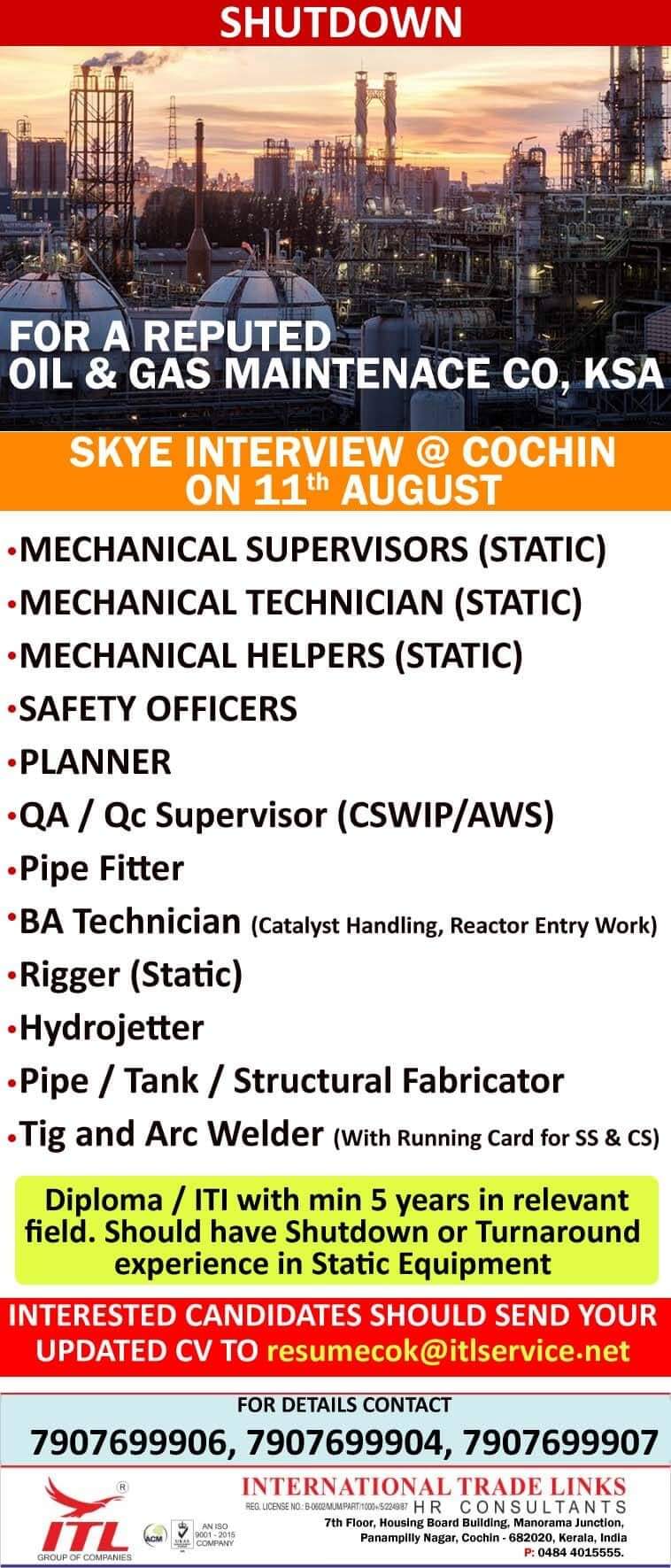 SHUTDOWN FOR A REPUTEDOIL & GAS MAINTENACE CO, KSASKYE INTERVIEW @ COCHINON 11th AUGUST•MECHANICAL SUPERVISORS (STATIC)• MECHANICAL TECHNICIAN (STATIC)MECHANICAL HELPERS …