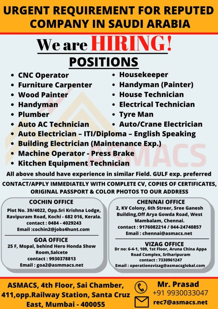 URGENT REQUIREMENT FOR REPUTEDCOMPANY IN SAUDI ARABIAWe are HIRING!POSITIONS• CNC Operator• Housekeeper• Furniture Carpenter Handyman (Painter)• Wood Painter• House Technician• …