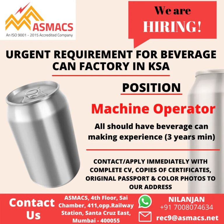 URGENT REQUIREMENT FOR BEVERAGECAN FACTORY IN KSAPOSITIONMachine OperatorAll should have beverage canmaking experience (3 years min)CONTACT/APPLY IMMEDIATELY WITHCOMPLETE CV, COPIES …