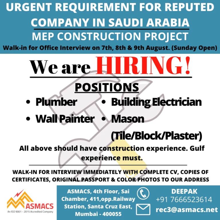 URGENT REQUIREMENT FOR REPUTEDCOMPANY IN SAUDI ARABIAMEP CONSTRUCTION PROJECTWalk-in for Office Interview on 7th, 8th & 9th August. (Sunday Open)We …