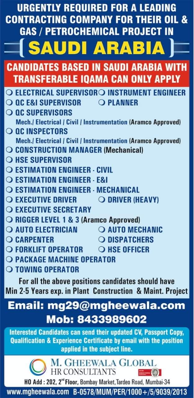 URGENTLY REQUIRED FOR A LEADINGCONTRACTING COMPANY FOR THEIR OIL &GAS / PETROCHEMICAL PROJECT INSAUDI ARABIACANDIDATES BASED IN SAUDI ARABIA WITHTRANSFERABLE …