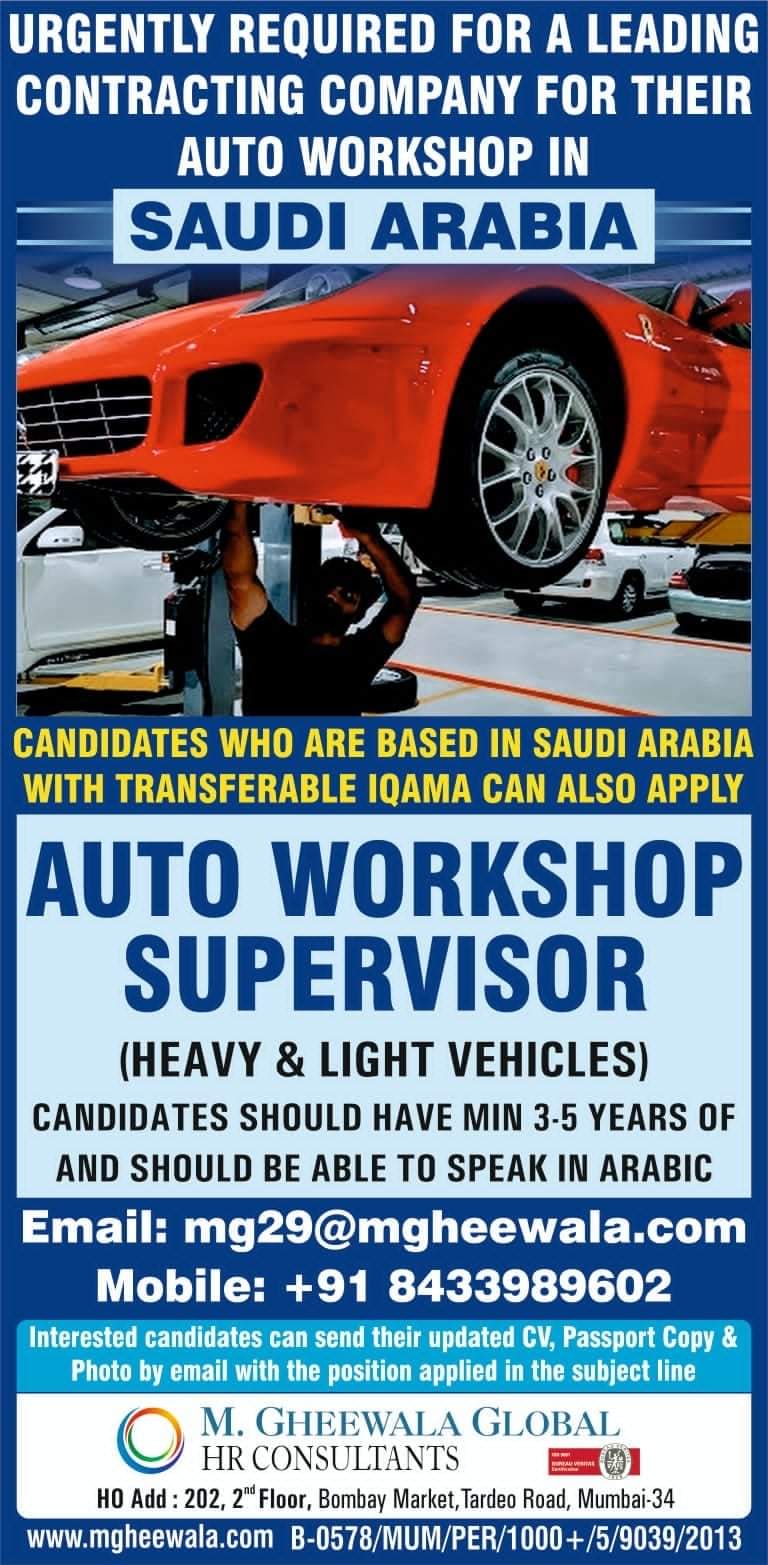 URGENTLY REQUIRED FOR A LEADINGCONTRACTING COMPANY FOR THEIRAUTO WORKSHOP IN SAUDI ARABIACANDIDATES WHO ARE BASED IN SAUDI ARABIAWITH TRANSFERABLE IQAMA …