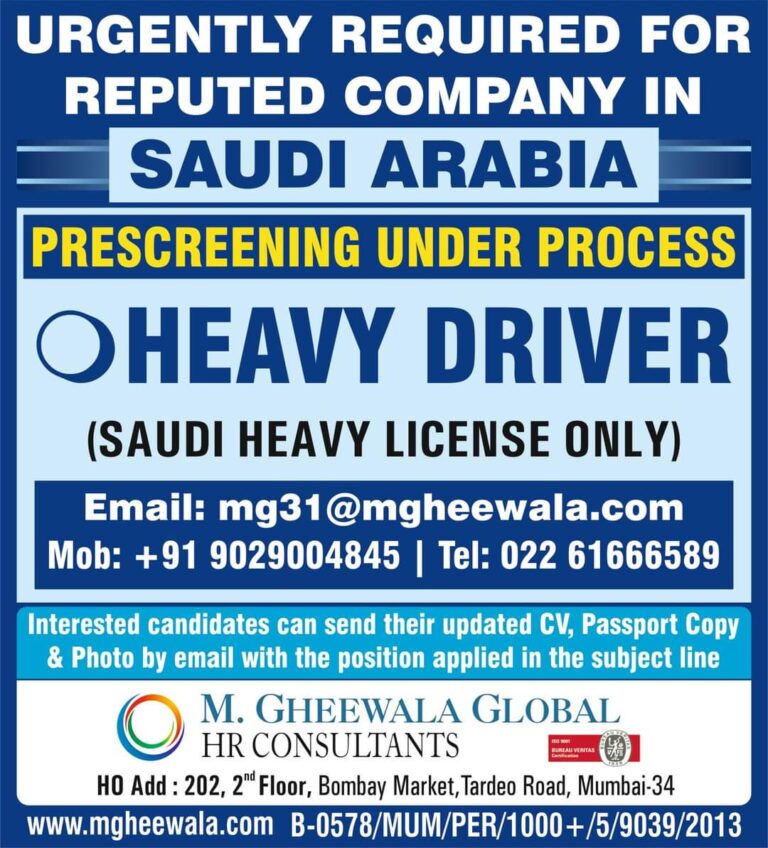 URGENTLY REQUIRED FORREPUTED COMPANY IN SAUDI ARABIAPRESCREENING UNDER PROCESSO HEAVY DRIVER(SAUDI HEAVY LICENSE ONLY)Email: mg31@mgheewala.comMob: +91 9029004845 Tel: 022 61666589Interested …