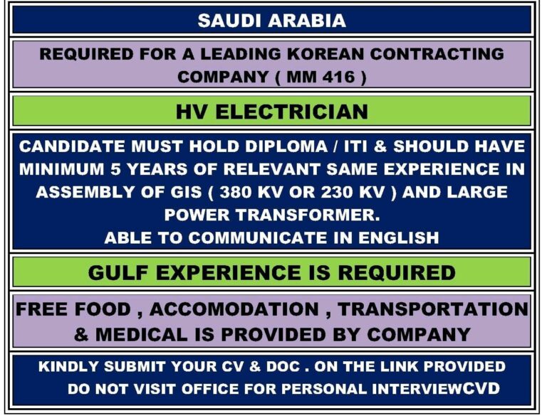 SAUDI ARABIAREQUIRED FOR A LEADING KOREAN CONTRACTINGCOMPANY (MM 416 ) HV ELECTRICIAN Apply hereCANDIDATE MUST HOLD DIPLOMA / ITI & …