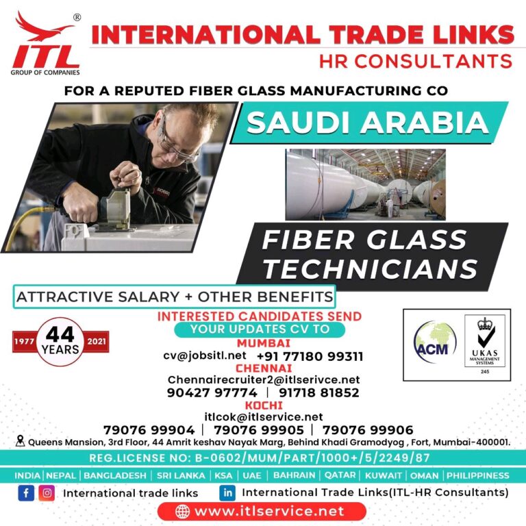 FOR A REPUTED FIBER CLASS MANUFACTURING COSAUDI ARABIAFIBER GLASSTECHNICIANSATTRACTIVE SALARY + OTHER BENEFITSINTERESTED CANDIDATES SENDYOUR UPDATES CV TOcv@jobsitl.net +91 77180 …