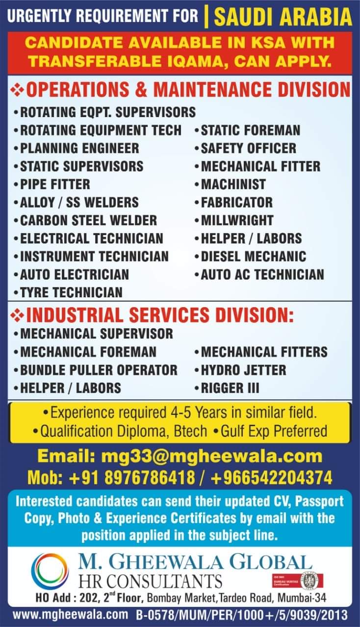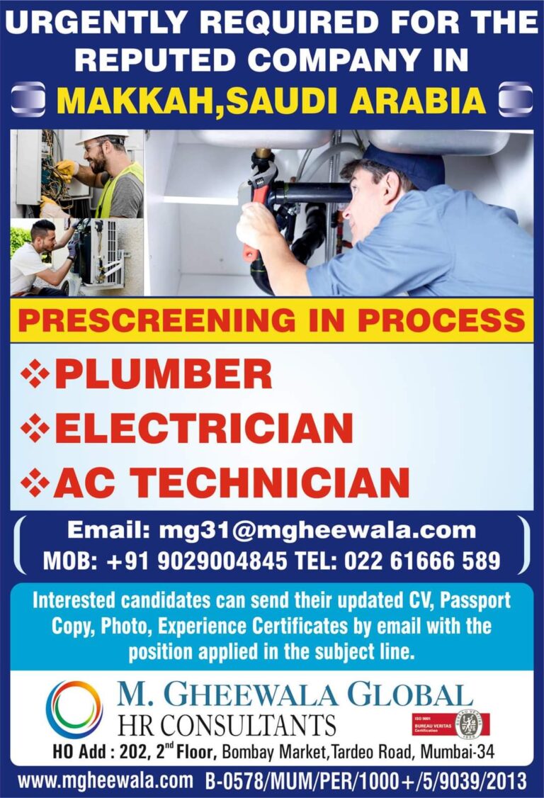 URGENTLY REQUIRED FOR THEREPUTED COMPANY IN ARABIA“PLUMBERELECTRICIAN“AC TECHNICIANEmail: mg31@mgheewala.com )MOB: +91 9029004845 TEL: 022 61666 589M. GHEEWALA GLOBAL HR CONSULTANTS