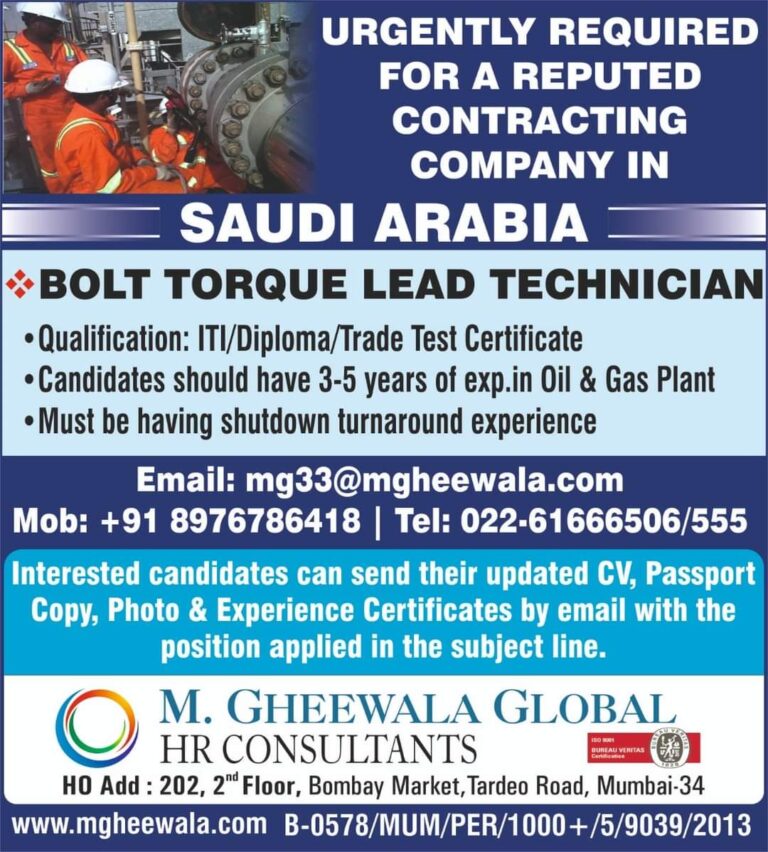 URGENTLY REQUIREDFOR A REPUTED CONTRACTINGCOMPANY IN SAUDI ARABIABOLT TORQUE LEAD TECHNICIAN• Qualification: ITI/DipIoma/Trade Test Certificate•Candidates should have 3-5 years of …