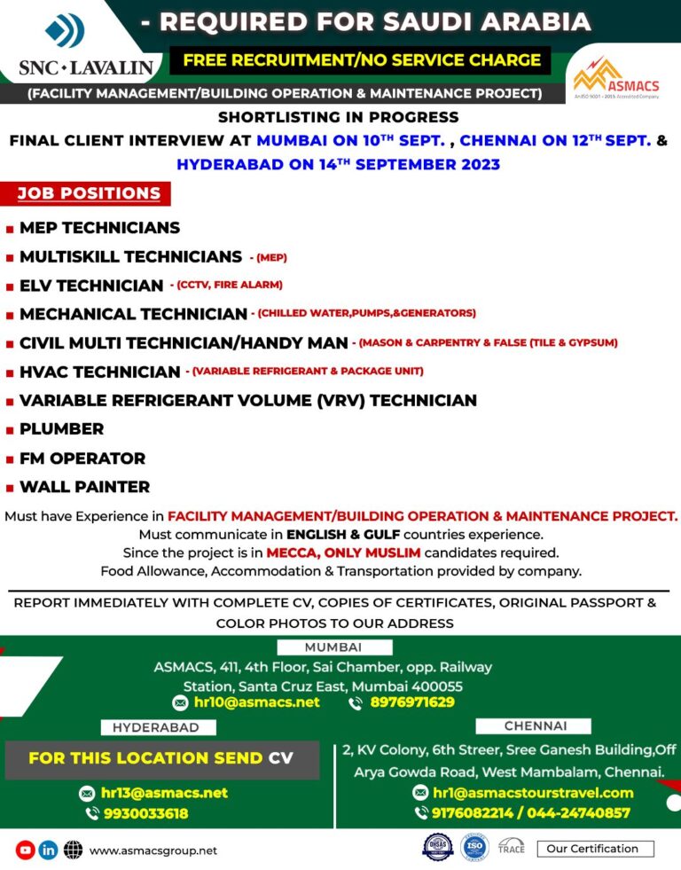SNC LAVALINREQUIRED FOR SAUDI ARABIAFREE RECRUITMENT/NO SERVICE CHARGE(FACILITY MANAGEMENT/BUILDING OPERATION & MAINTENANCE PROJECT)SHORTLISTING IN PROGRESSFINAL CLIENT INTERVIEW AT MUMBAI ON …