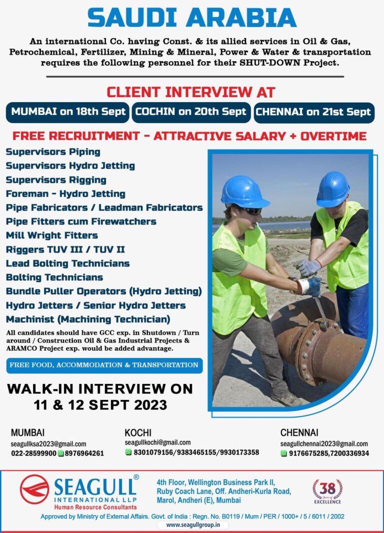 SAUDI – SHUTDOWN / TURNAROUND JOBTURNAROUND & INSPECTION PROJECTSEND YOUR UPDATED RESUME, EXPERIENCE & QUALIFICATION CERTIFICATES COLOR COPYFOR SHORTLISTINGagpintl.team12@gmail.comPOSTING DATE …