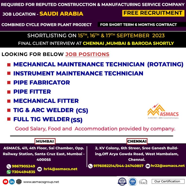 REQUIRED FOR REPUTED INDUSTRIAL COMPANYJOB LOCATION – SAUDI ARABIAASMACSAn ISO 9001-2015 Accredited CompanyFINAL CLIENT INTERVIEW AT CHENNAI ON 05TH & …