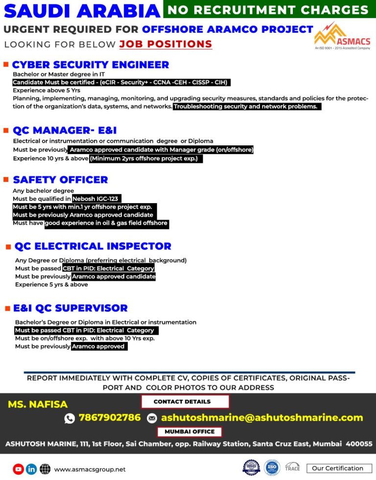 SAUDI ARABIANO RECRUITMENT CHARGESURGENT REQUIRED FOR OFFSHORE ARAMCO PROJECTAAASMACSLOOKING FOR BELOW JOB POSITIONS• CYBER SECURITY ENGINEERBachelor or Master degree in …