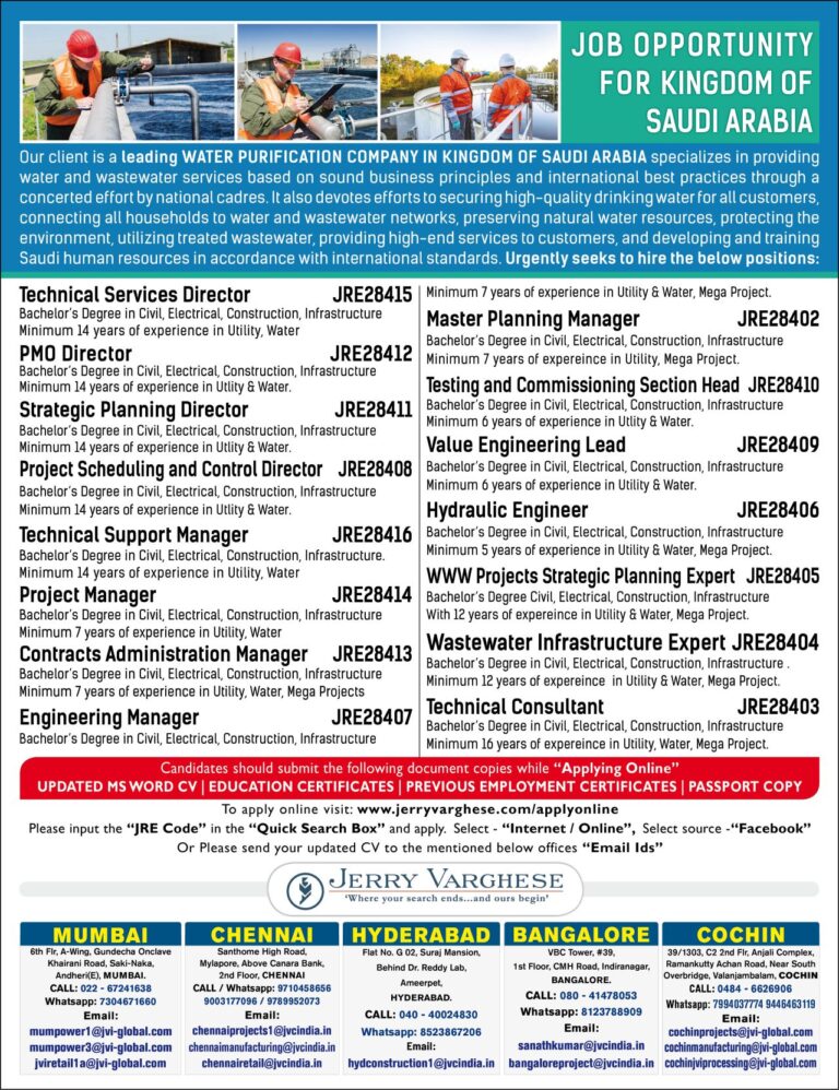 JOB OPPORTUNITY FOR KINGDOM OFSAUDI ARABIAOur client is a leading WATER PURIFICATION COMPANY IN KINGDOM OFSAUDI ARABIA specializes in providing …