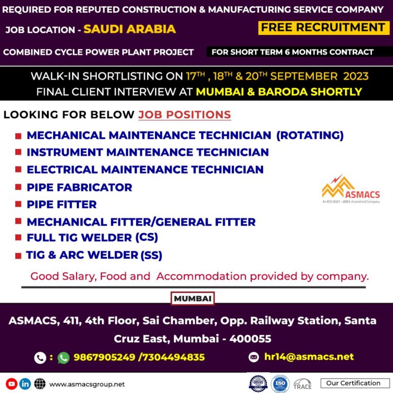 REQUIRED FOR REPUTED CONSTRUCTION & MANUFACTURING SERVICECOMPANY JOB LOCATION – SAUDI ARABIAFREE RECRUITMENTCOMBINED CYCLE POWER PLANT PROJECT FOR SHORT TERM …