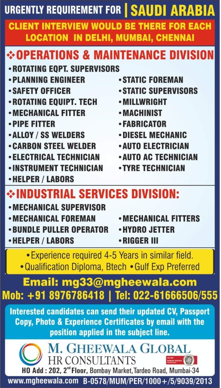 URGENTLY REQUIREMENT FOR SAUDI ARABIACLIENT INTERVIEW WOULD BE THERE FOR EACH’LOCATION IN DELHI, MUMBAI, CHENNAI*OPERATIONS & MAINTENANCE DIVISION•ROTATING EQPT. SUPERVISORS•PLANNING …
