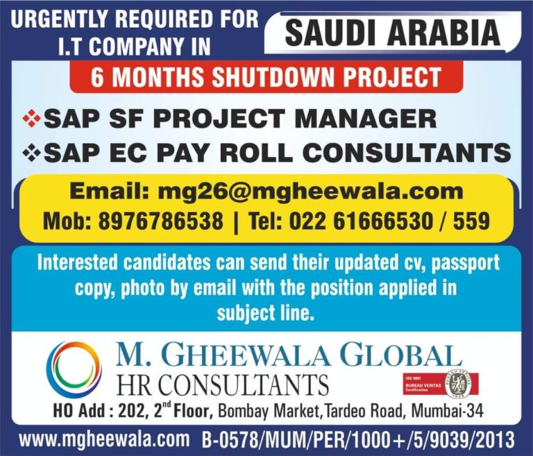 URGENTLY REQUIRED FORSAUDI ARABIAI.T COMPANY IN6 MONTHS SHUTDOWN PROJECT•SAP SF PROJECT MANAGER*SAP EC PAY ROLL CONSULTANTSEmail: mg26@mgheewaIa.comMob: 8976786538 | Tel: …