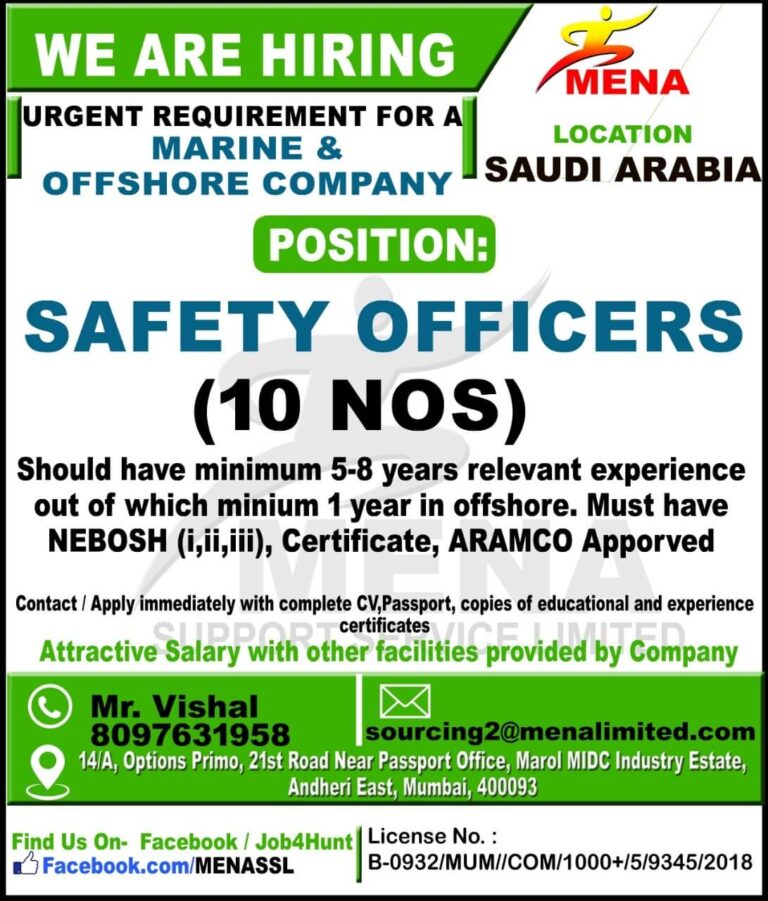 URGENT REQUIREMENT FORLOCATIONMARINE &SAUDI ARABIOFFSHORE COMPANYPOSITION:SAFETY OFFICERS(10 NOS)Should have minimum 5-8 years relevant experienceout of which minium 1 year in …