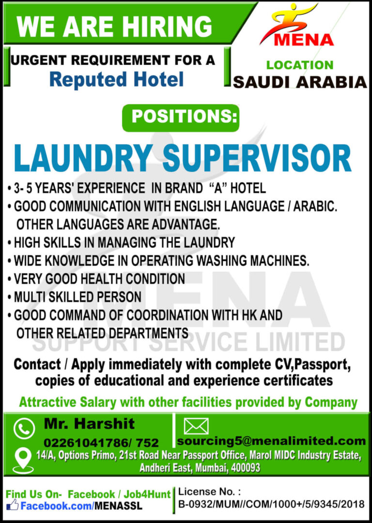 URGENT REQUIREMENT FOR A MENALOCATION Reputed Hotel SAUDI ARABIAPOSITIONS:LAUNDRY SUPERVISOR• 3-5 YEARS’ EXPERIENCE IN BRAND “A” HOTEL• GOOD COMMUNICATION WITH …