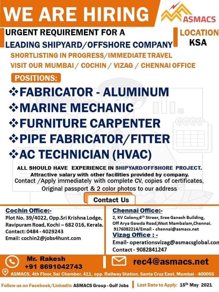 URGENT REQUIREMENT FOR AASMACSLOCATIONLEADING SHIPYARD/OFFSHORE COMPANY KSASHORTLISTING IN PROGRESS/IMMEDIATE TRAVELVISIT OUR MUMBAI/ COCHIN/ VIZAG / CHENNAI OFFICEPOSITIONS:*FABRICATOR – ALUMINUM*MARINE MECHANIC*FURNITURE …