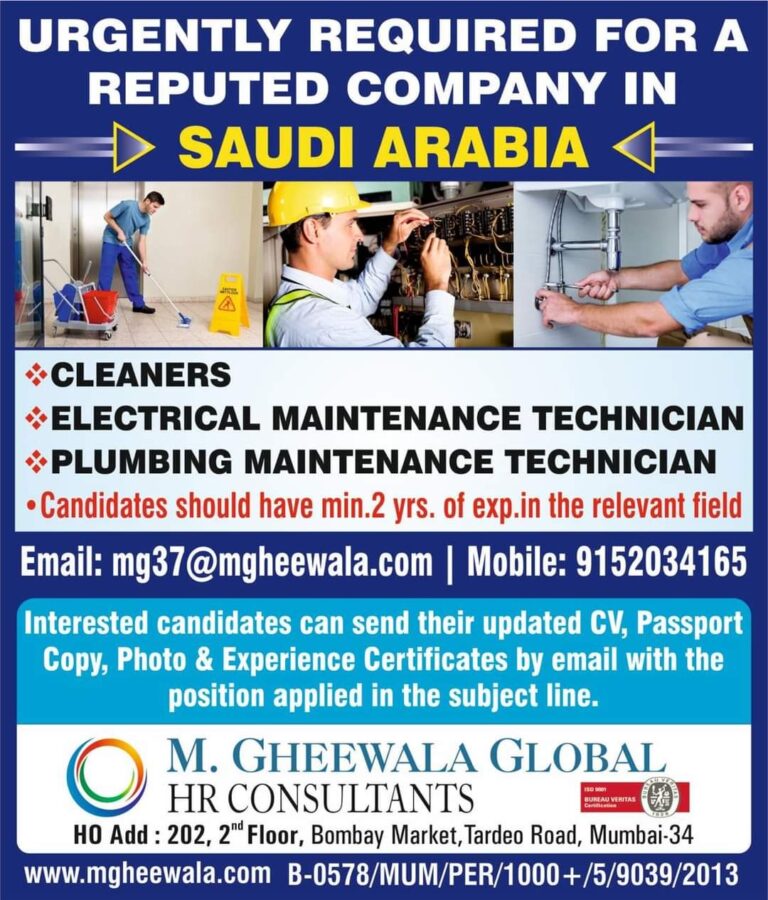 URGENTLY REQUIRED FOR AREPUTED COMPANY INCLEANERSELECTRICAL MAINTENANCE TECHNICIANPLUMBING MAINTENANCE TECHNICIANCandidates should have min.2 yrs. of exp.in the relevant fieldEmail: mg37@mgheewala.com …