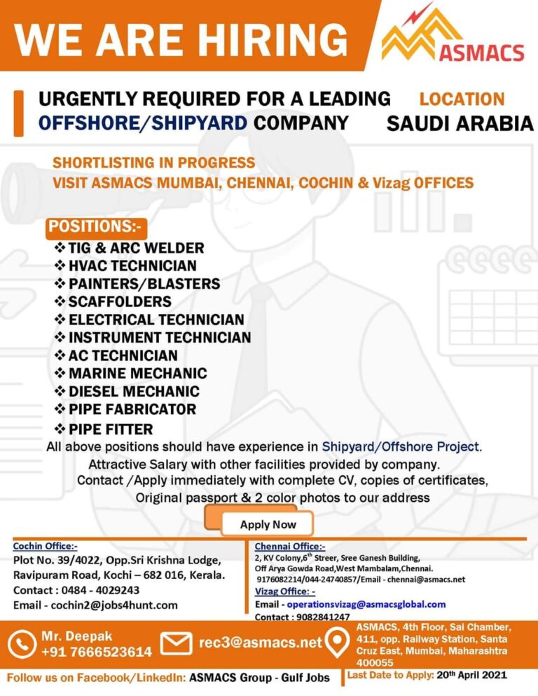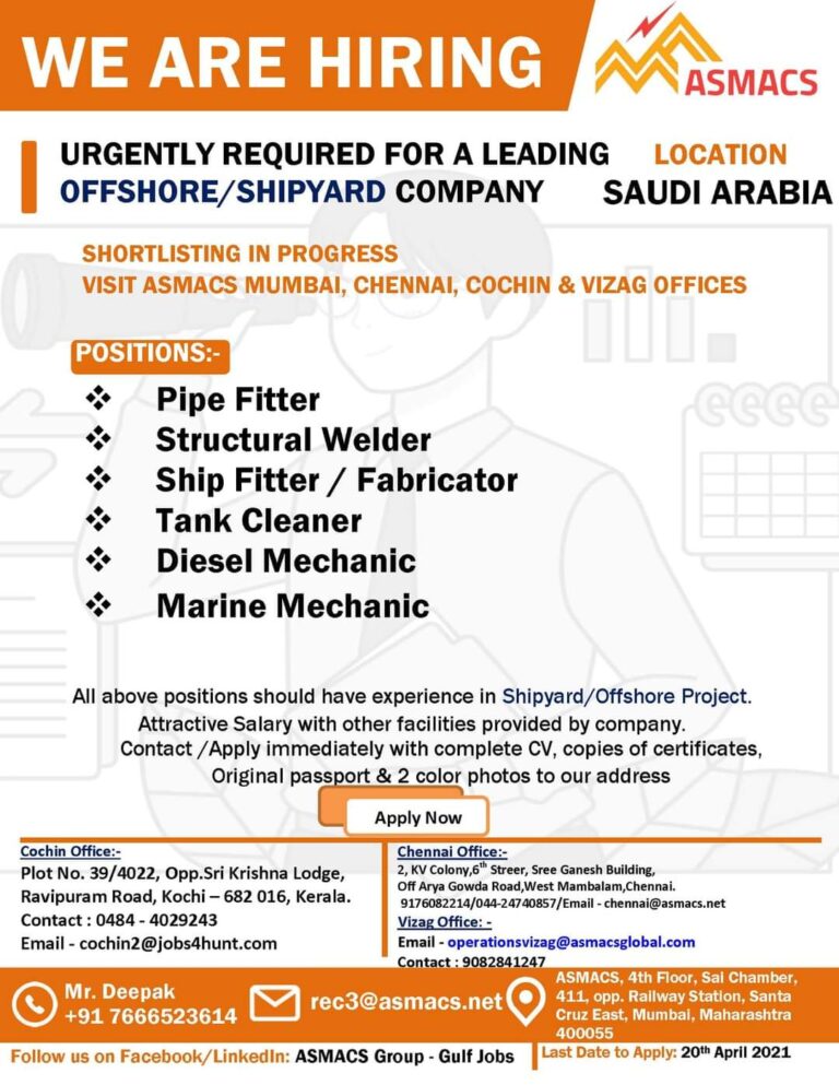 URGENTLY REQUIRED FOR A LEADINGLOCATIONOFFSHORE/SHIPYARD COMPANY SAUDI ARABIASHORTLISTING IN PROGRESSVISIT ASMACS MUMBAI, CHENNAI, COCHIN & VIZAG OFFICESPOSITIONS:-Pipe FitterStructural WelderShip Fitter …
