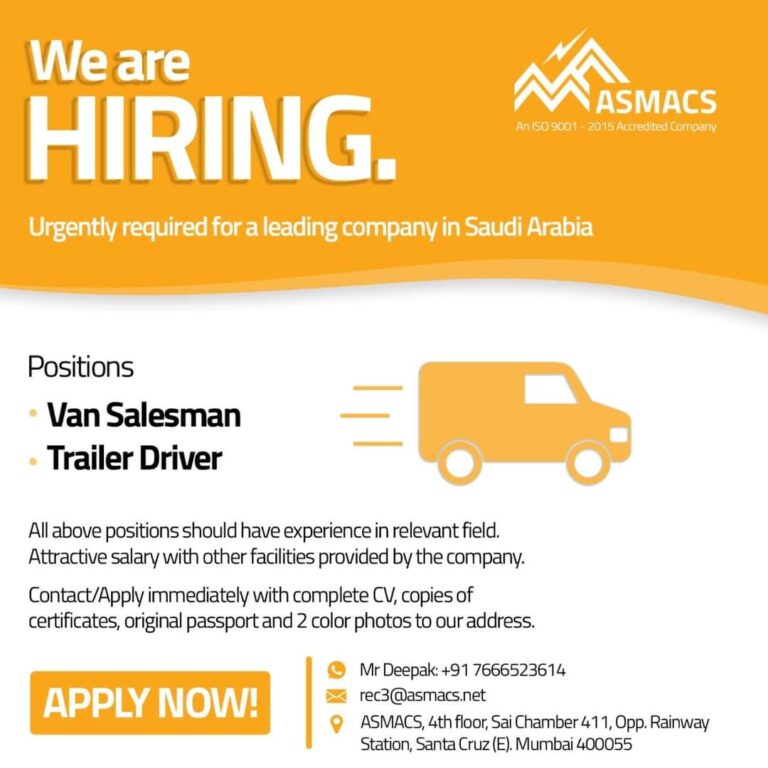 Urgently required for a leading company in Saudi ArabiaPositionsVan SalesmanTrailer DriverAll above positions should have experience in relevant field.Attractive salary …