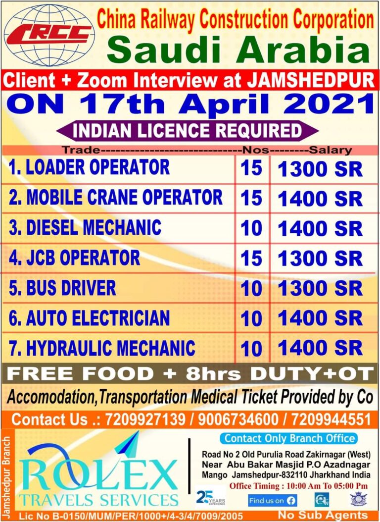 REQUIRED FOR SAUDI ARABIAZOOM INTERVIEWCHINA RAILWAYAT JAMSHEDPURCONSTRUCTIONON 1710412021CORPORATION COMPANYCate oI.LOADER OPERATOR2.MOBlLE CRANE OPERATOR 063.DlESEL MECHANIC4.JCB OPERATOR5.BUS DRIVER6.AUTO ELECTRICIAN7.HYDRAULlC MECHANICNEED INDIAN …