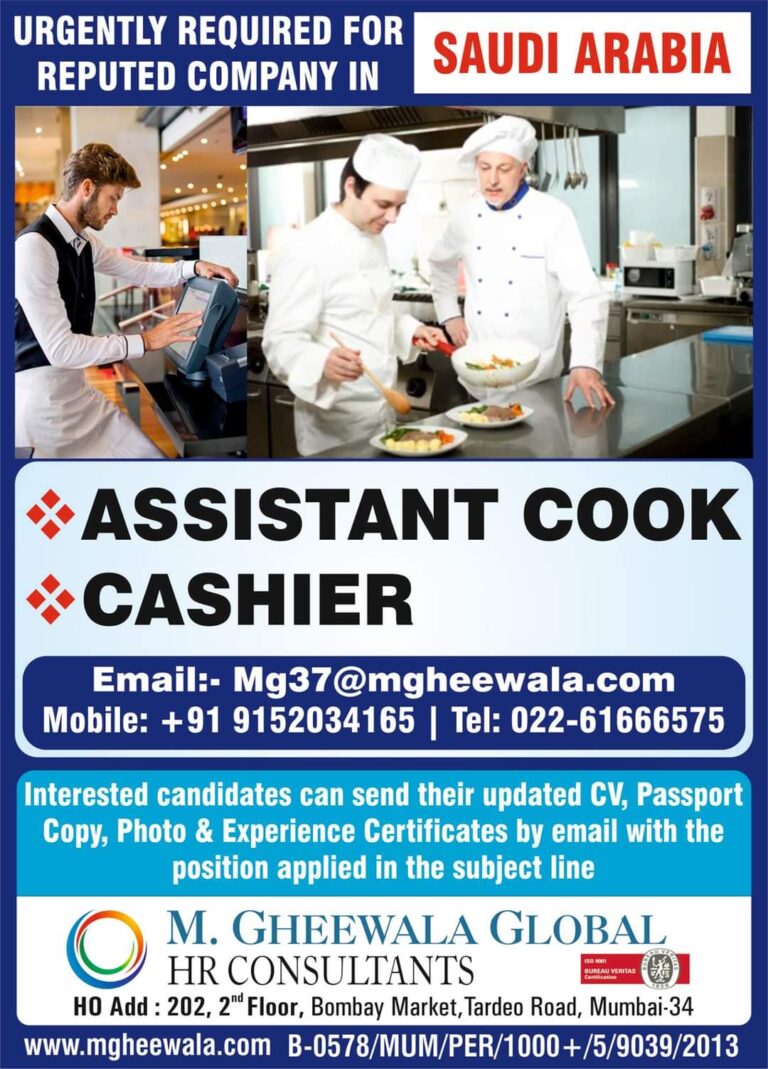 ASSISTANT COOKCASHIEREmail:- Mg37@mgheewaIa.comMobile: +91 9152034165 | Tel: 022-61666575Interested candidates can send their updated CV, PassportCopy, Photo & Experience Certificates by …
