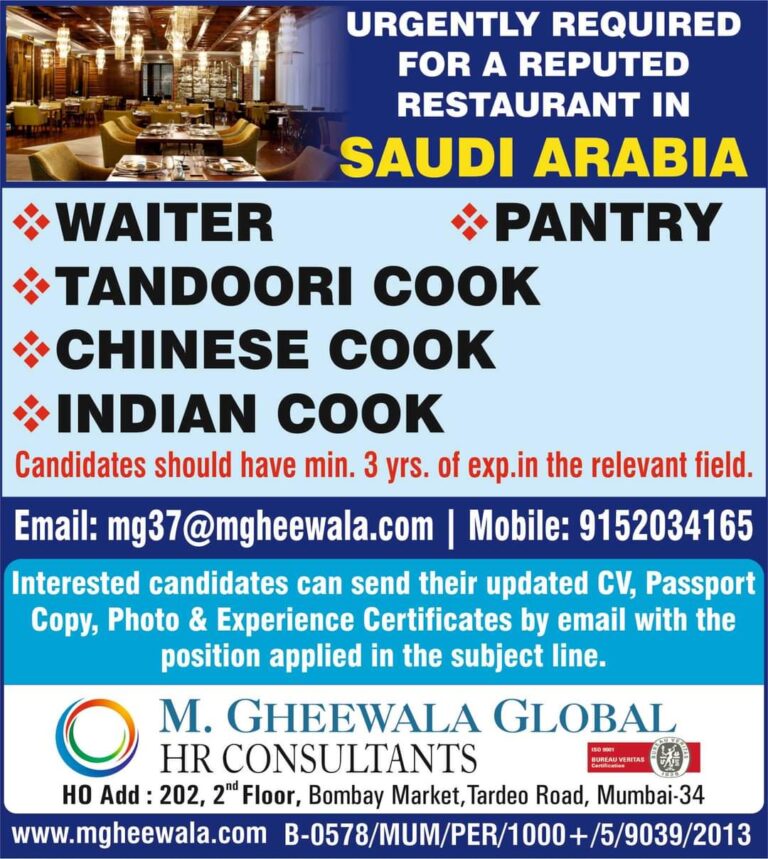 URGENTLY REQUIRED FOR A REPUTEDRESTAURANT IN SAUDI ARABIAPANTRYTANDOORI COOKCHINESE COOKINDIAN COOKCandidates should have min. 3 yrs. of exp.in the relevant …